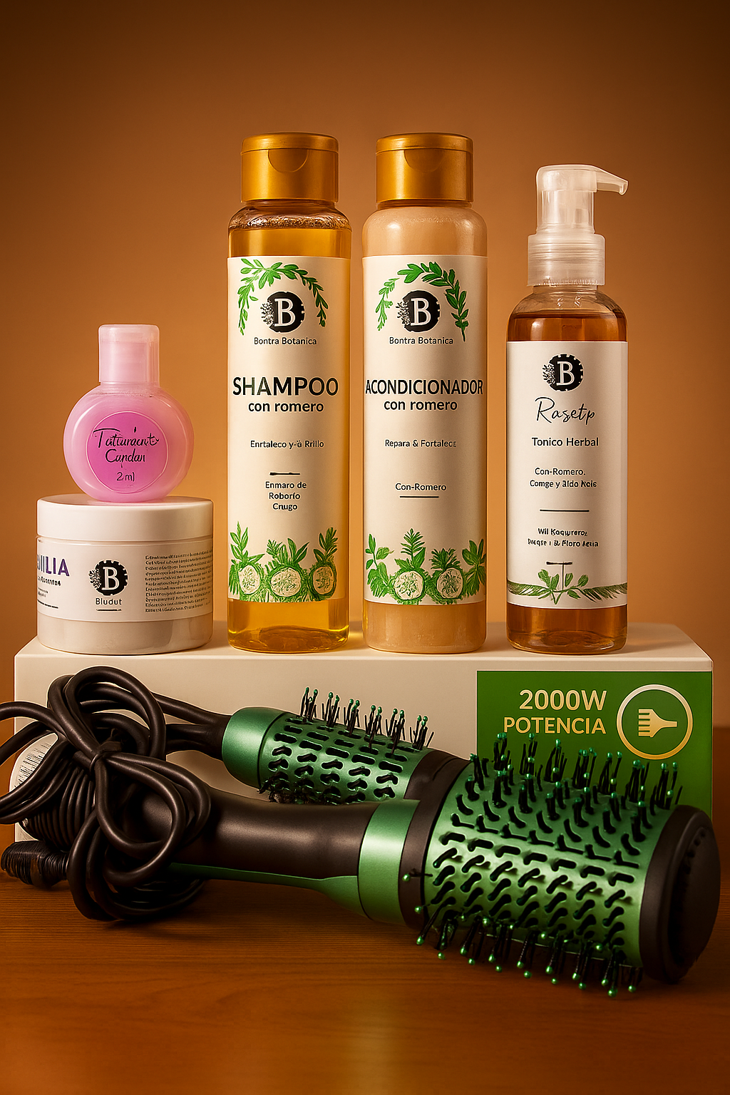 Este completo kit capilar está formulado con extracto de romero y otros ingredientes naturales que fortalecen el cuero cabelludo, estimulan el crecimiento, nutren profundamente y devuelven el brillo y la suavidad al cabello. Además, incluye un cepillo secador profesional de regalo para lograr un acabado de salón desde casa.
