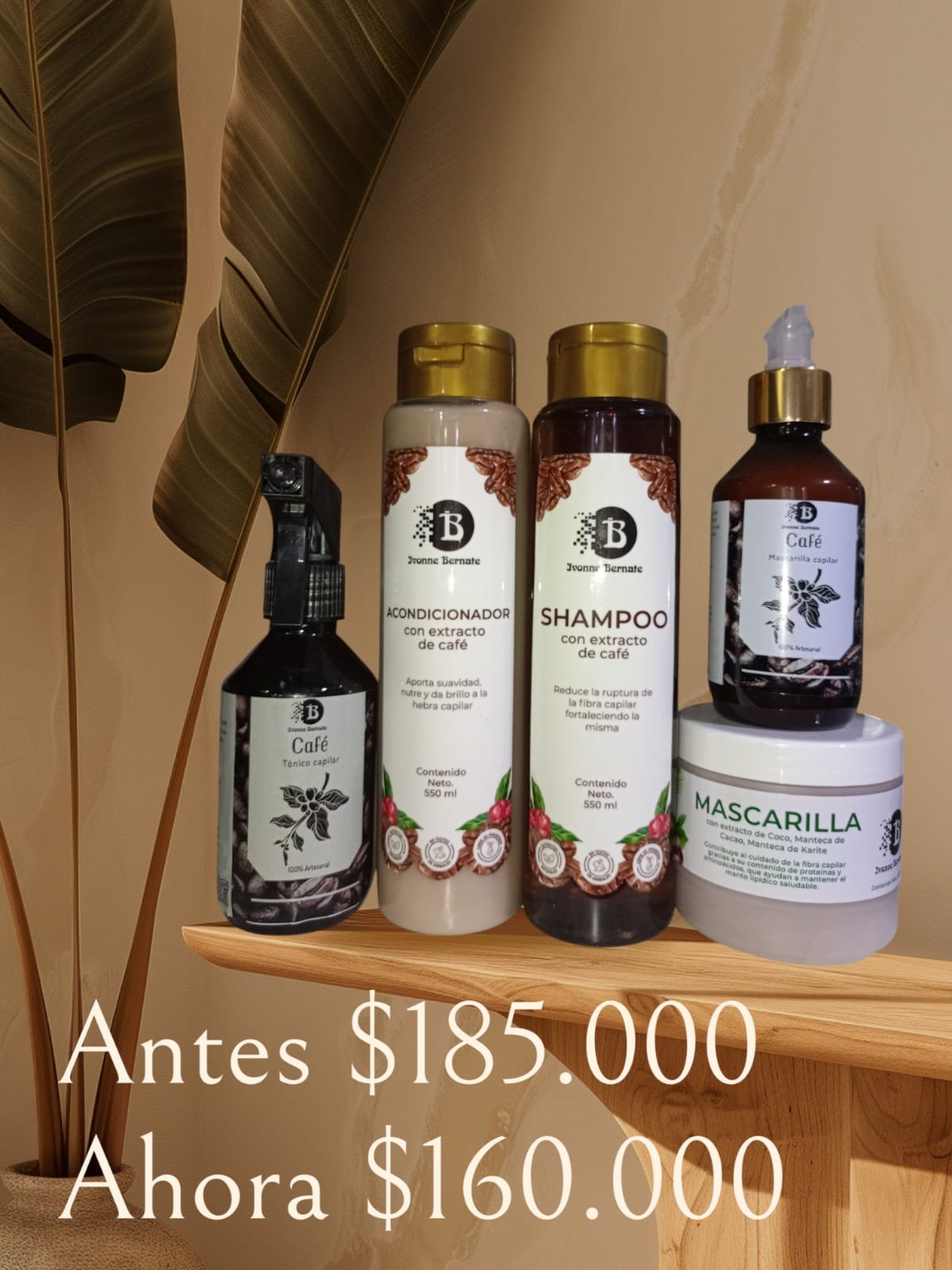 “Kit capilar de café: estimula el crecimiento, fortalece y deja tu cabello suave e hidratado desde la raíz hasta las puntas. Incluye shampoo, acondicionador, tónico, mascarilla hidratante y mascarilla leave-in.
